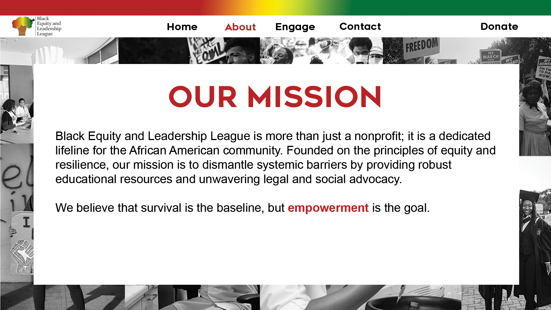 The website for the Black Equity and Leadership League (BELL) serves as a digital hub for a non-profit organization focused on the advocacy, empowerment, and education of Black youth. The platform drives community engagement by offering clear pathways for visitors to donate, volunteer, or participate in youth speaking initiatives. Visually, the organization pays homage to African heritage through its use of the Pan-African color palette (red, yellow, and green) and a logo that celebrates Black youth in their natural state.