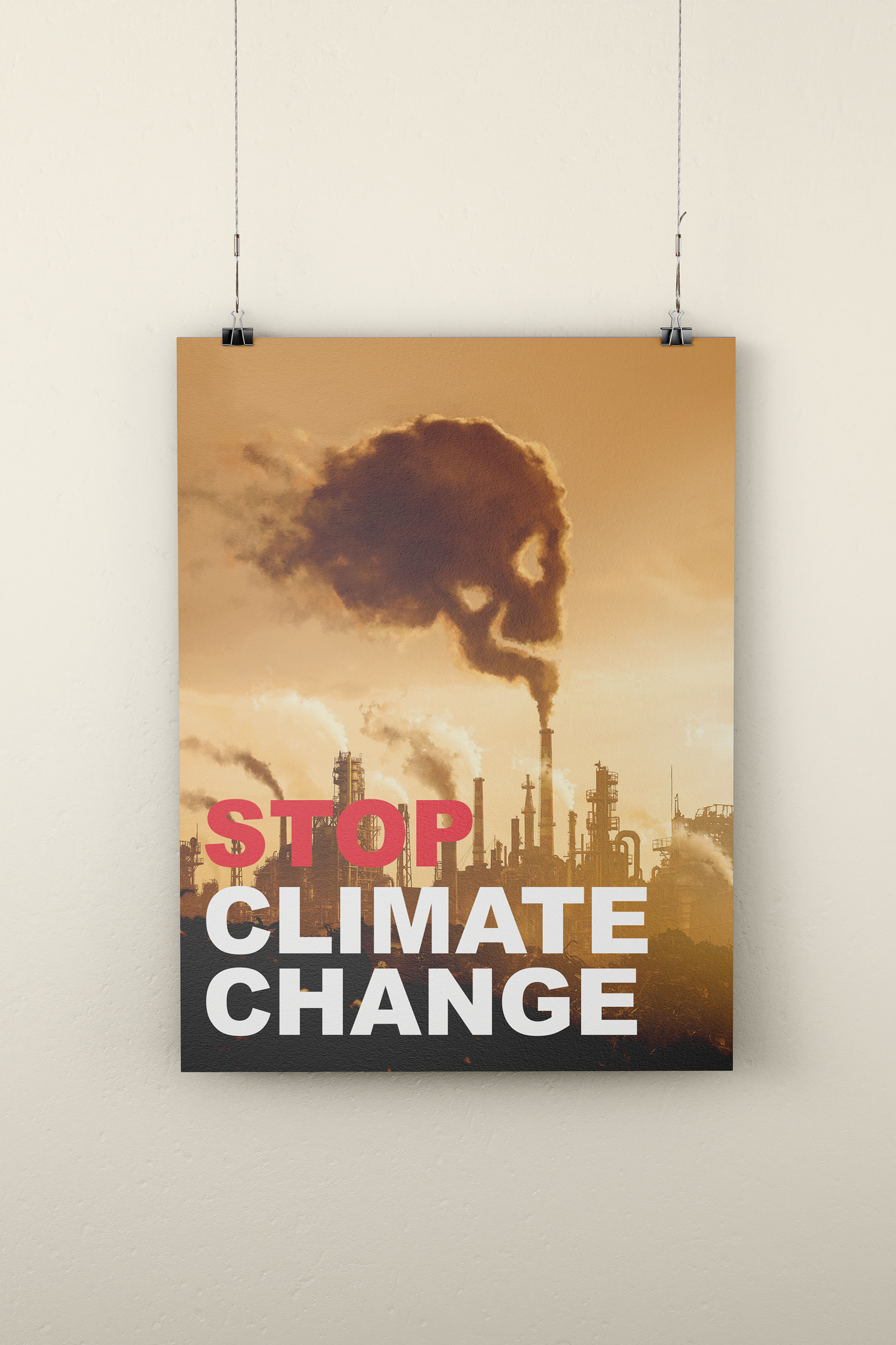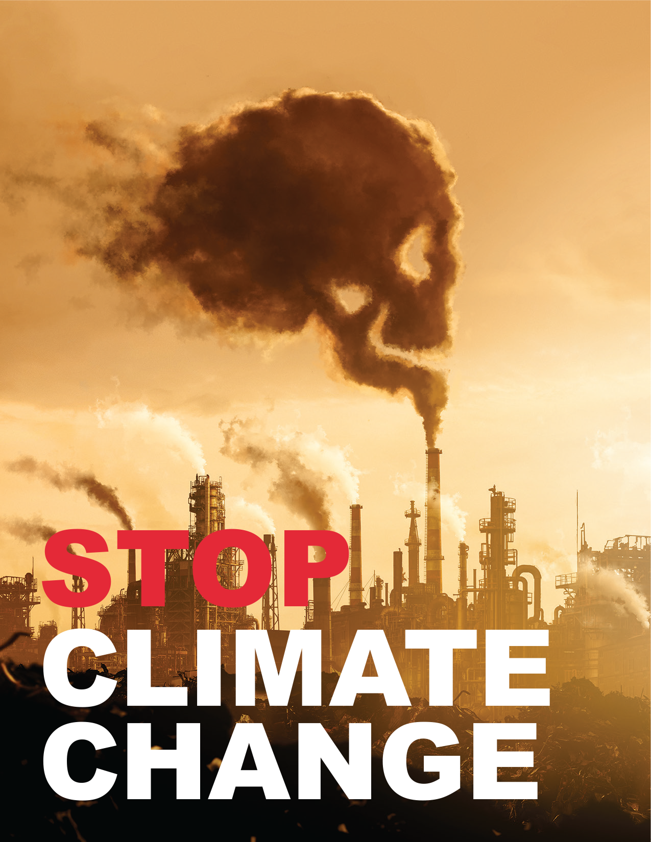 I used aggressive typography. The word ‘STOP’ is rendered in a bright, warning-sign red, followed by ‘CLIMATE CHANGE’ in white, all in an all-caps sans-serif typeface. The contrast between the red and white text adds urgency and emphasis. This design, in its color palette and symbolism, is visually disruptive and designed to stop viewers in their tracks.